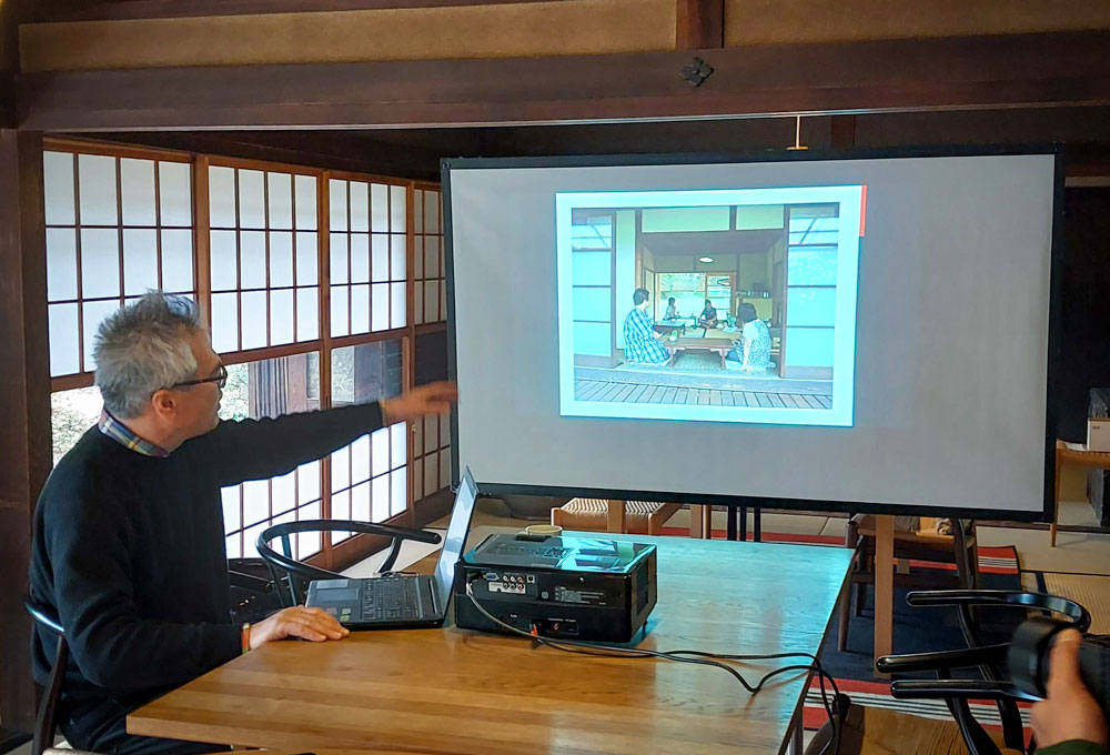3世代が集う風景と旧原田邸の施設を説明する辻さん