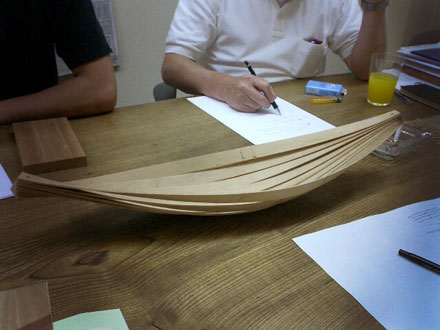 展示会終了後、早速三原助手にインテリア小物開発の相談を持ちかけた。 逆に三原助手から、まずアイデアの数を出して試作をしながら絞り込んでいくこと、そのためにチーム体制で進めること提案された。 中山に了承を得た三原助手は、各業界で活躍する岡山県立大学の卒業生に声をかけ、最終的に5名のデザイナーが参加することとなった。 早速Skypeでオンラインミーティングを始めたデザイナーチームは、このプロジェクトを「竹集成材プロジェクト」と銘打ち、各自が持ち寄ったアイデアスケッチをメールで共有しながら、夜半のSkypeミーティングで議論を重ね、アイデアをブラッシュアップしていった。竹集成材の認知を高めることがプロジェクトのミッションであるため、竹の素材感をアピールできるもの、竹である必然性を備えたもの、竹でしかできないフォルムを実現したものを中心に選定することになった。 会議の最中、当時ロンドンで開催されていた「100%Design」展が、2005年11月に日本で初開催されることを知り、プロジェクトの発表を「100%Design Tokyo」に定めた時にはすでに梅雨が明けようとしていた。展示会まで残りたった3ヶ月強、そこから怒涛の開発に突入した。 腹を括った中山とテオリのスタッフも、次々と持ち込まれる図面をもとに無理を押して試作を進めた。